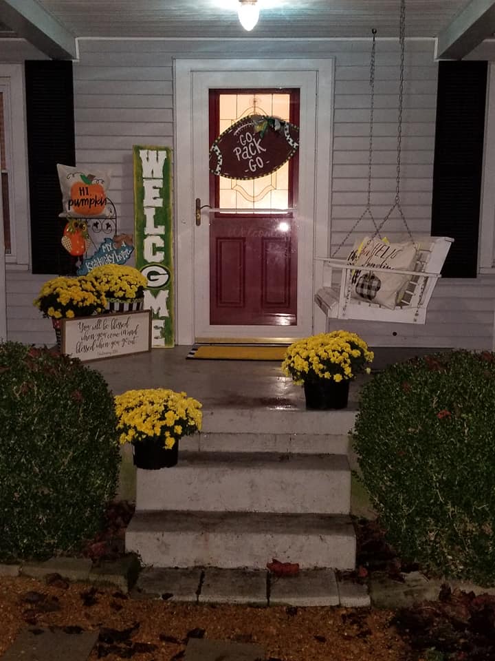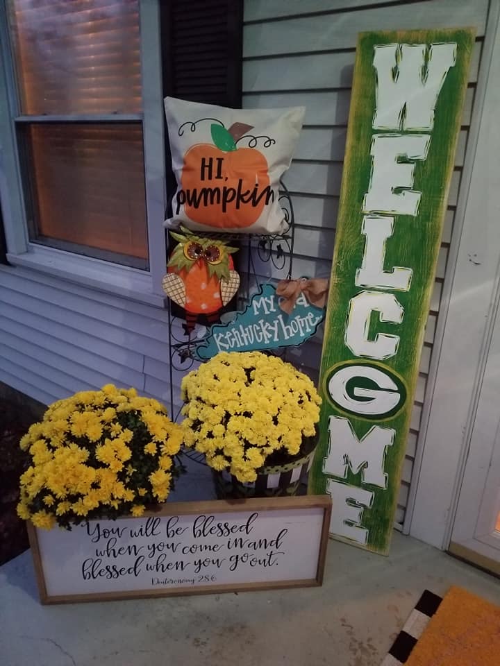 Check out what I done with my Amazon finds, Packers decor and some other things I had in the spare closet! I am loving how it is all coming together and guess what?? Even though I am late getting it all out I think maybe just maybe at this point I can keep my mums alive through Thanksgiving! That has never happened!!!
